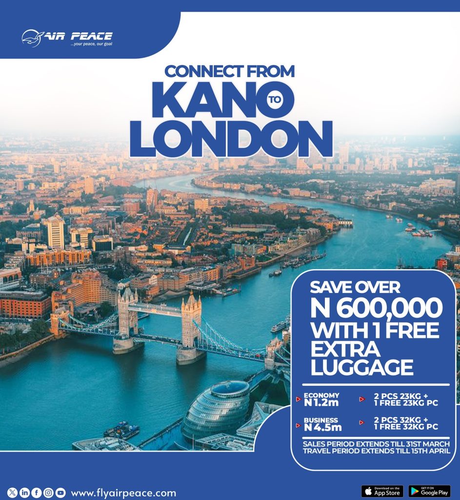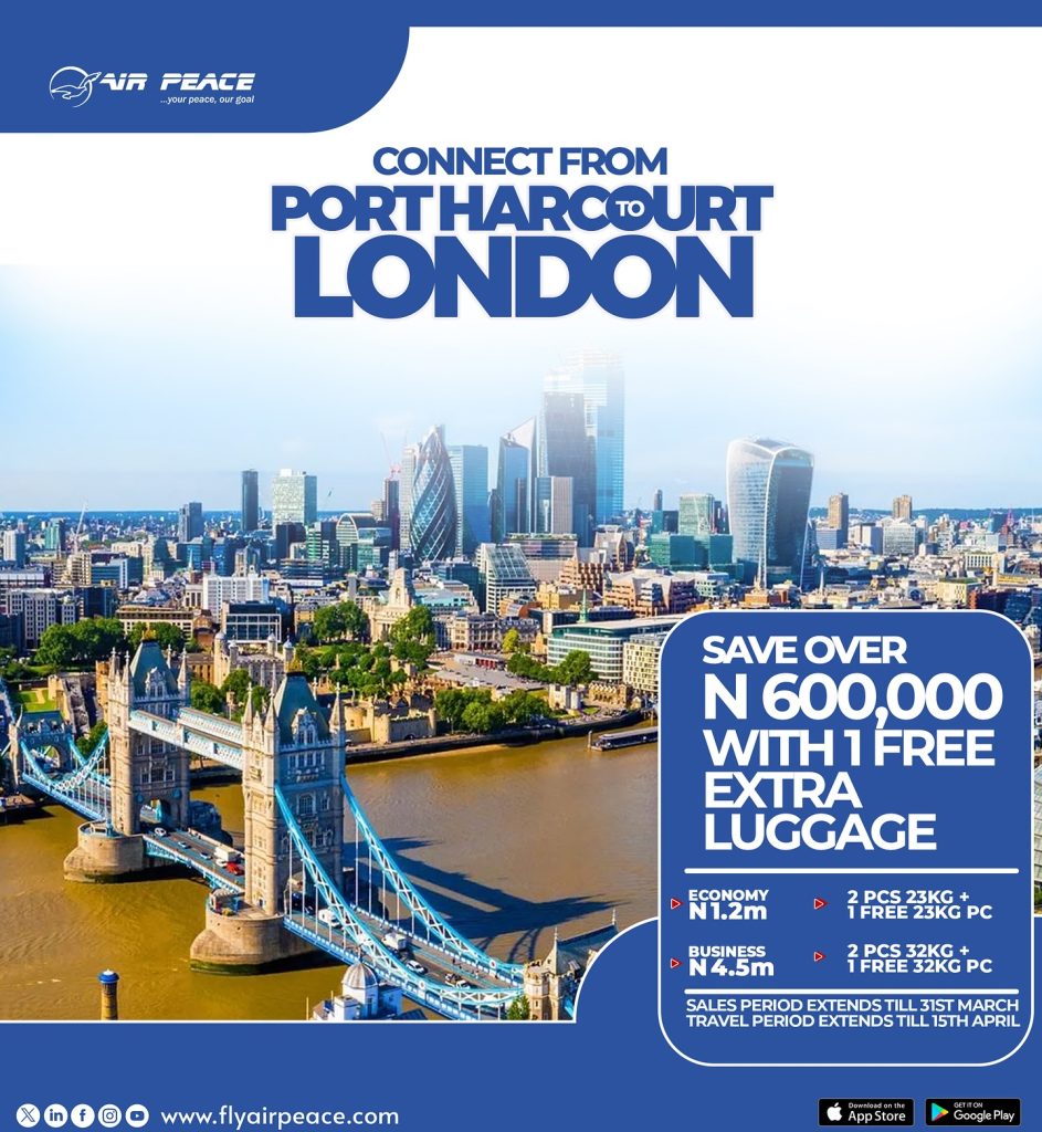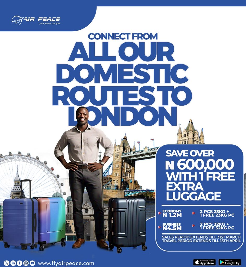 In a statement from Dr. Ejike Ndiulo, the Head of Corporate Communications, Air Peace said this promotion allows travelers connecting from cities across Nigeria to London to bring one additional piece of luggage without extra charges.